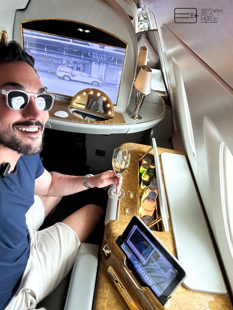Vale reforçar que a viagem com a Emirates começa bem antes de embarcar no voo. Quem viaja na primeira classe deles conta com o serviço de motorista privativo, que te pega em casa ou no hotel e te leva para o aeroporto (e vice-versa).