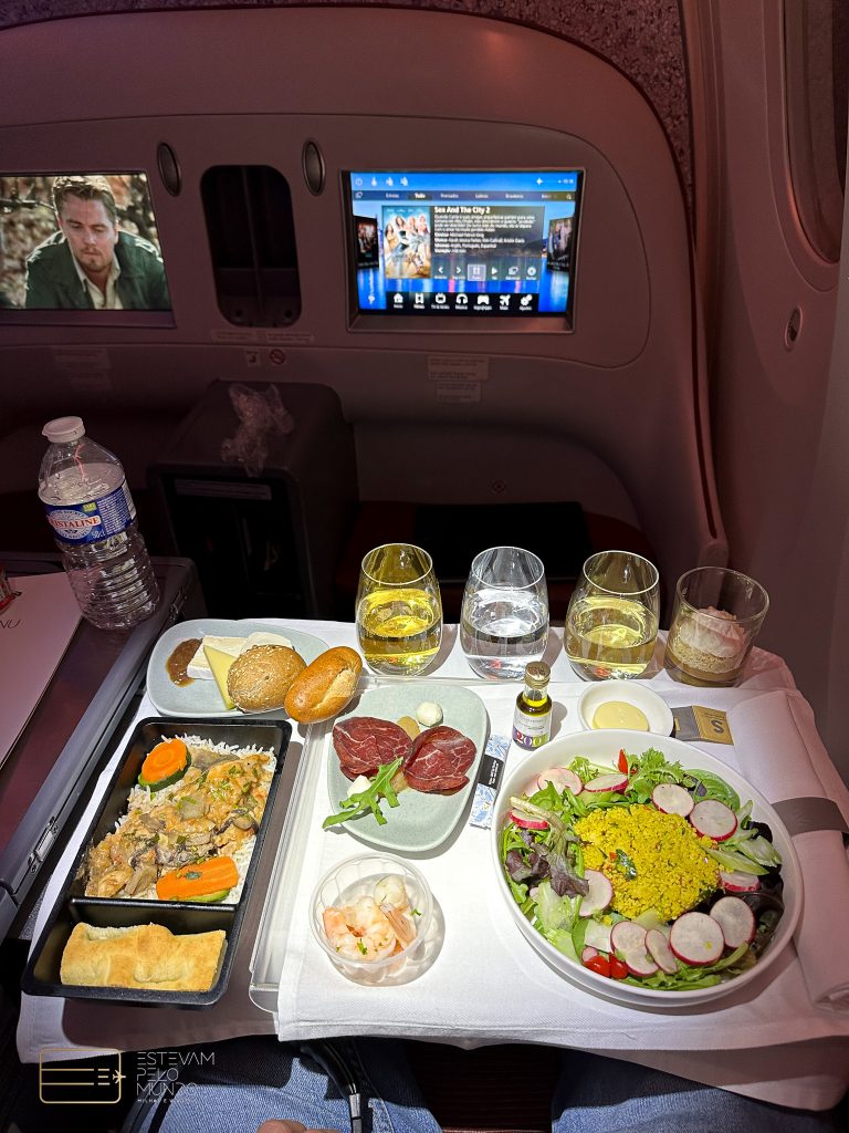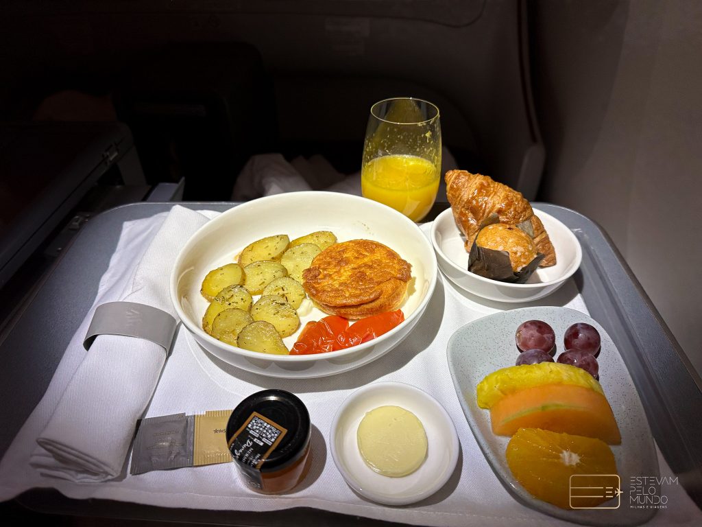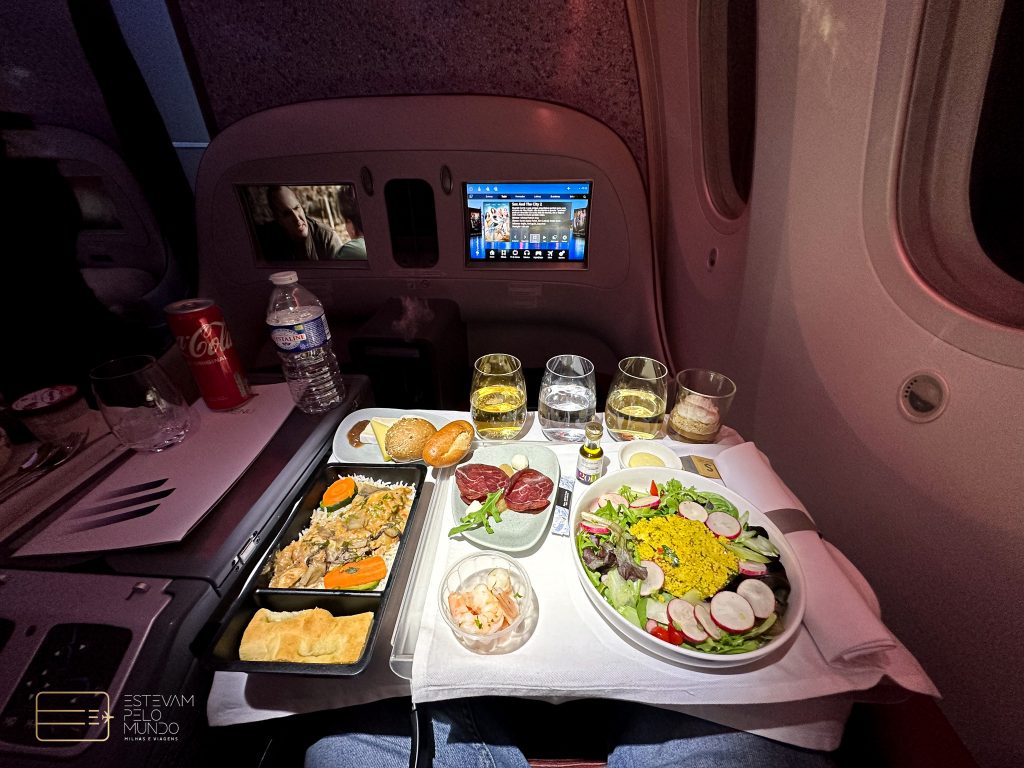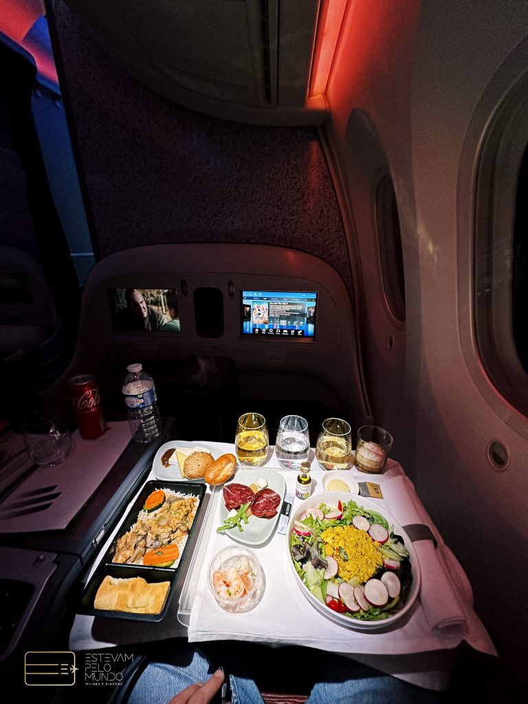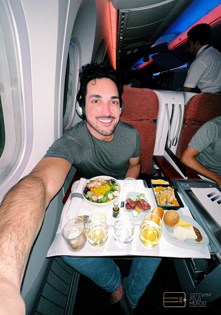 Até aqui tudo bem. O problema desse voo foi na hora da refeição (jantar). A classe executiva não tinha nenhuma proteína para servir aos passageiros. Por isso, trouxeram um prato da classe econômica. Já no café da manhã, foi tudo normal.