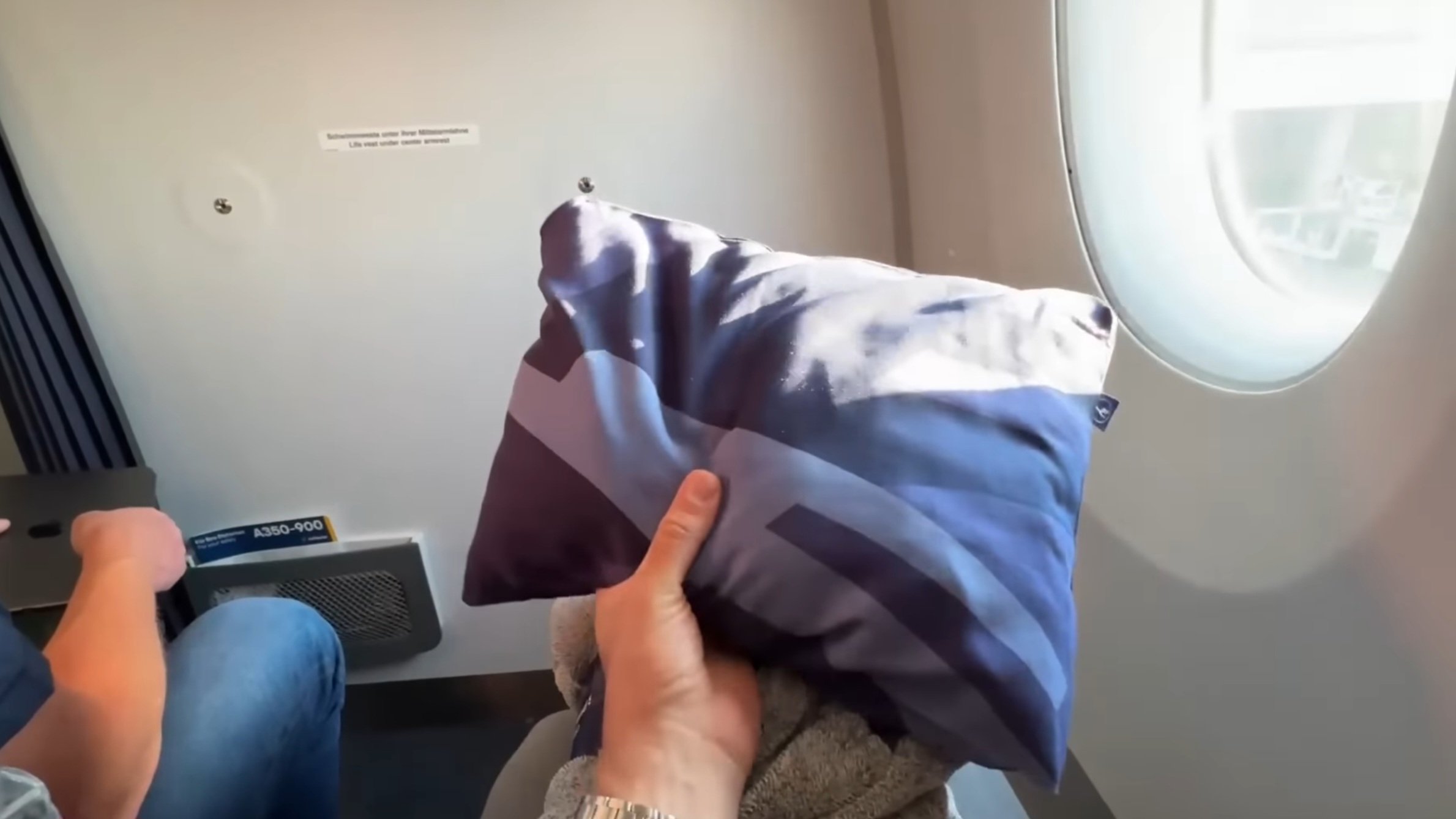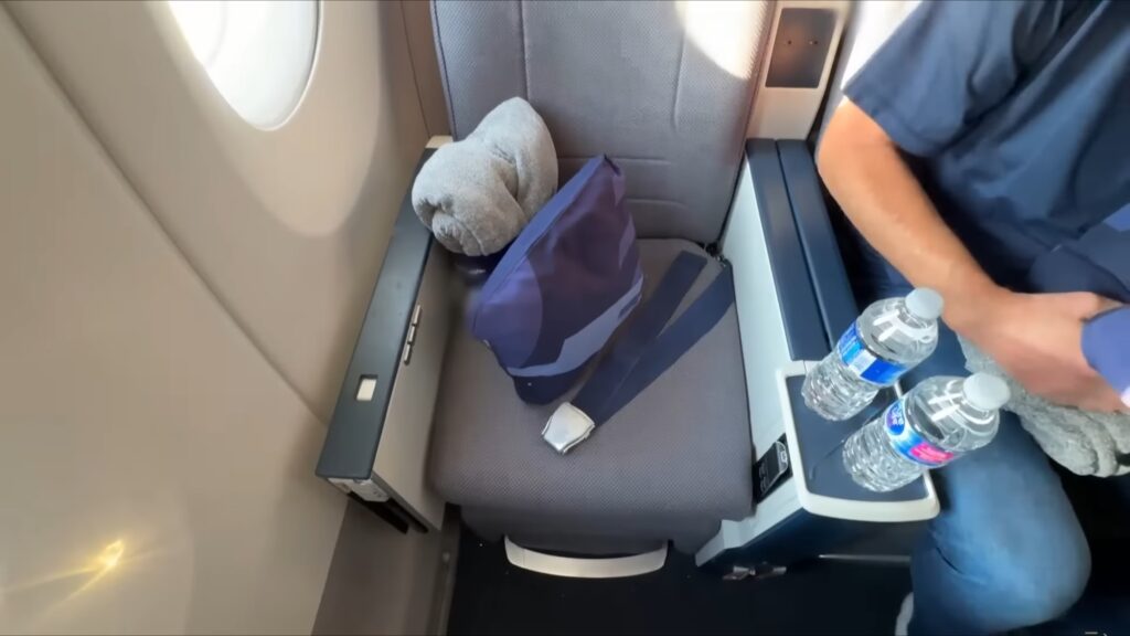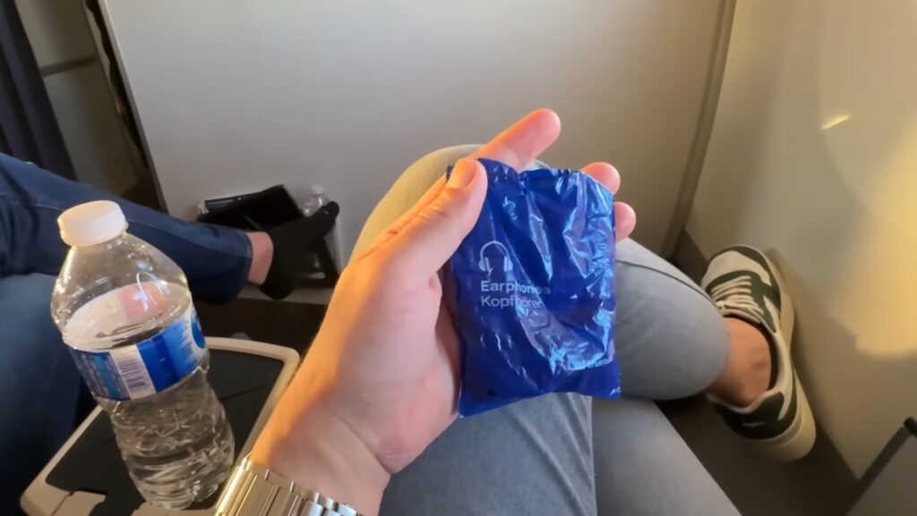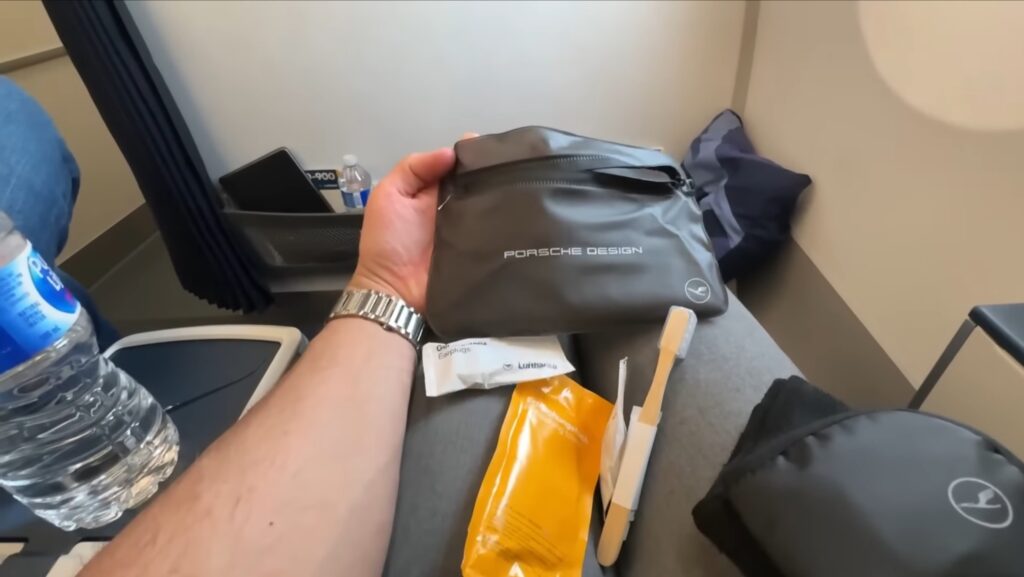 Cada passageiro recebeu uma manta e um travesseiro simples e uma garrafa de água ao embarcar. Também recebemos um amenity kit em parceria com a Porsche Desing, que contava com: protetores de ouvido; kit dental; toalha úmida; tapa olhos; e meias.