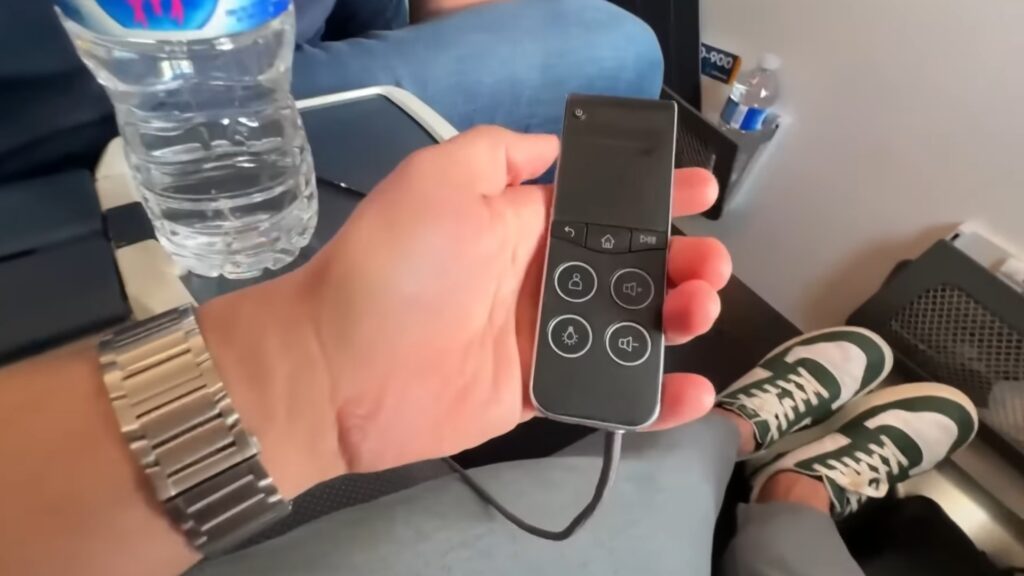No braço do assento tínhamos um controle tinha as opções de chamar o comissário, controlar a luz de leitura e a tela de entretenimento.