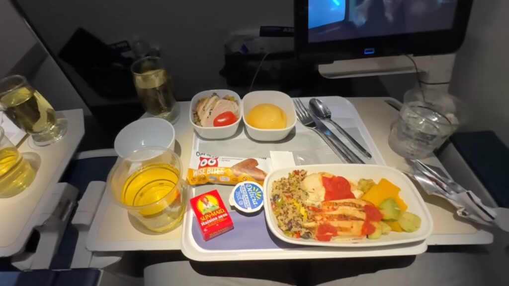 No início do serviço de bordo, eles passaram servindo bebidas alcoólicas e não alcoólicas junto com um snack com glúten. Mesmo eu colocando no site da companhia aérea que queria a refeição sem glúten, não recebi snack e tive que esperar pela bandeja com a refeição completa seguindo a restrição que eu havia solicitado.