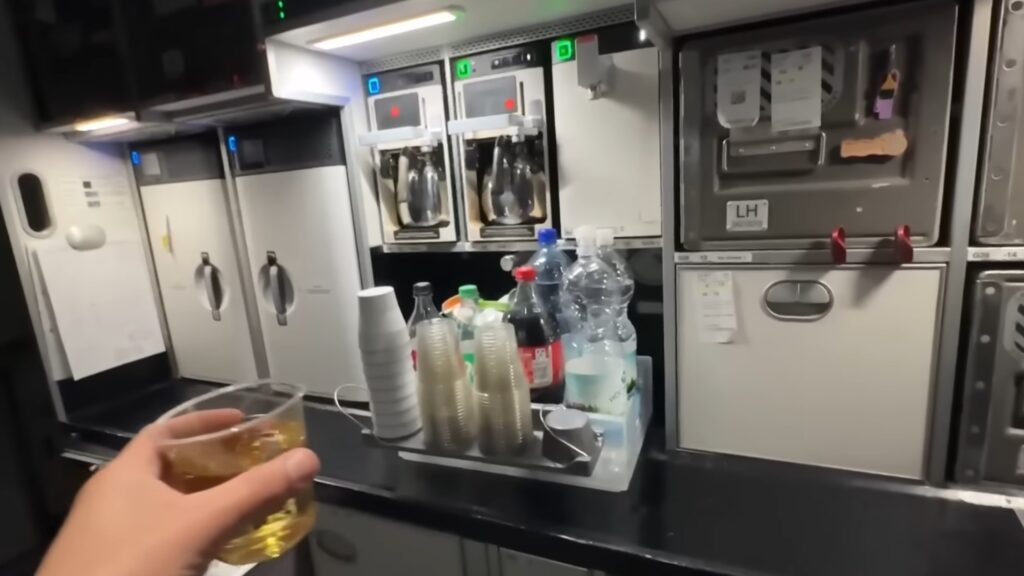 Uma coisa que achei ineressante é que os comissários deixavam uma espécie de minibar na galley para que os passageiros pudessem pegar a bebida que quisessem ao longo do voo.
