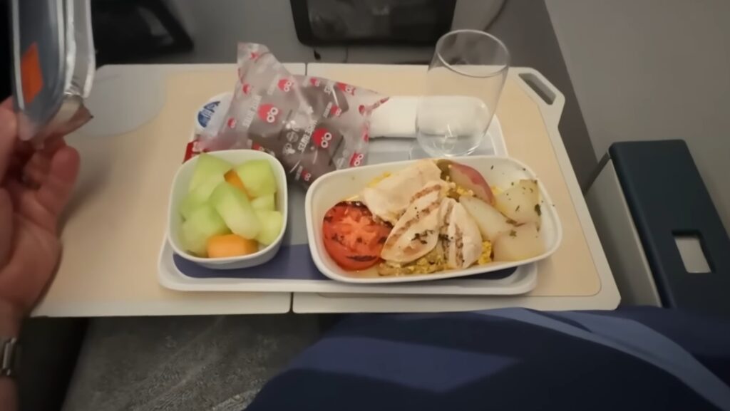 Chegando na Europa tivemos a nossa segunda refeição. Na minha opção sem glúten, o café da manhã tinha frango (de novo), junto com frutas e um bolo, acompanhado de bebidas.