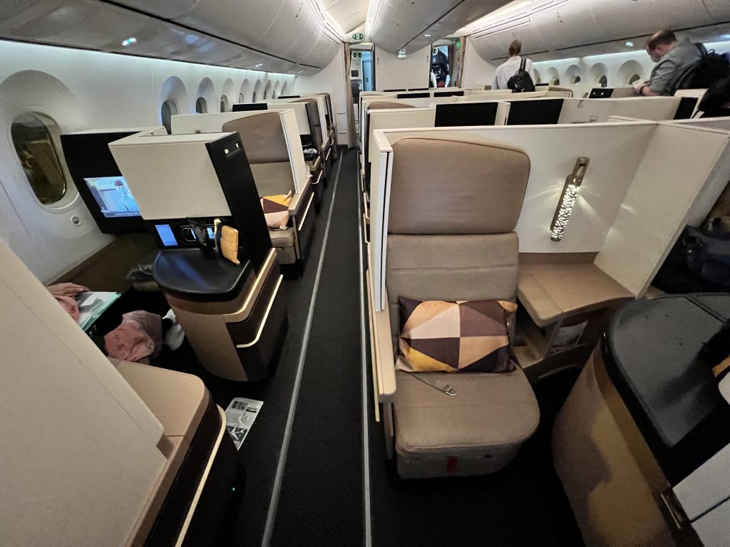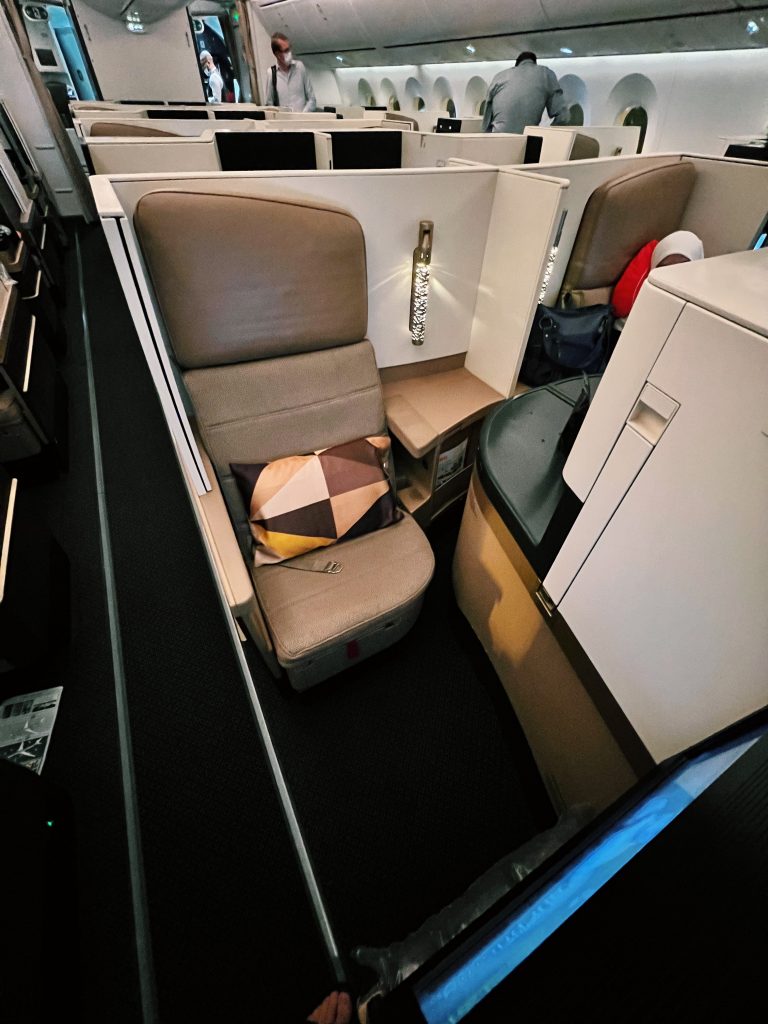 Esta viagem foi feita em um Boeing 787-900 Dreamliner e a viagem teve duração de 8h35. A executiva tem configuração 1 – 2 – 1 com acesso ao corredor em todos os assentos. Além disso, possuem um sistema que fecha parte do assento para garantir maior privacidade. Não chega a ser uma cabine privativa, mas já proporciona uma privacidade bem maior.