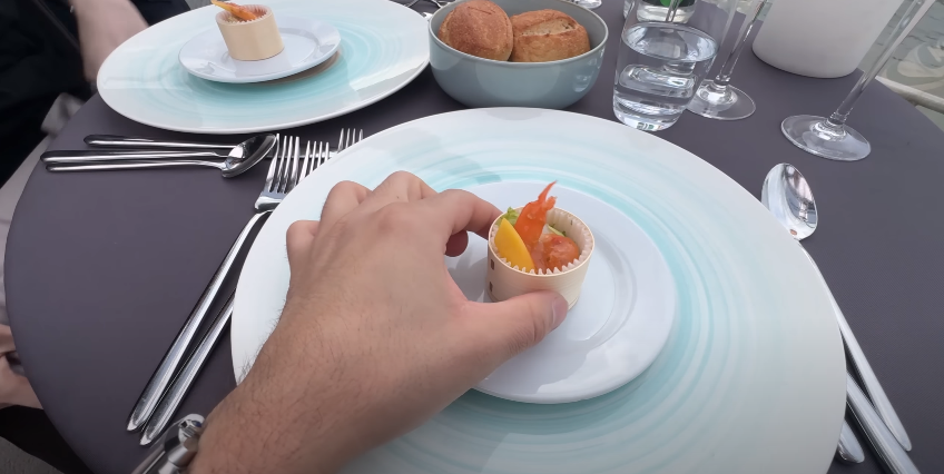 Ao entrar no barco, você será levado por um funcionário até a sua mesa e, em seguida, receberá água e pães. Logo depois, vem o champanhe de boas-vindas enquanto escolhíamos o que íamos comer através do menu.