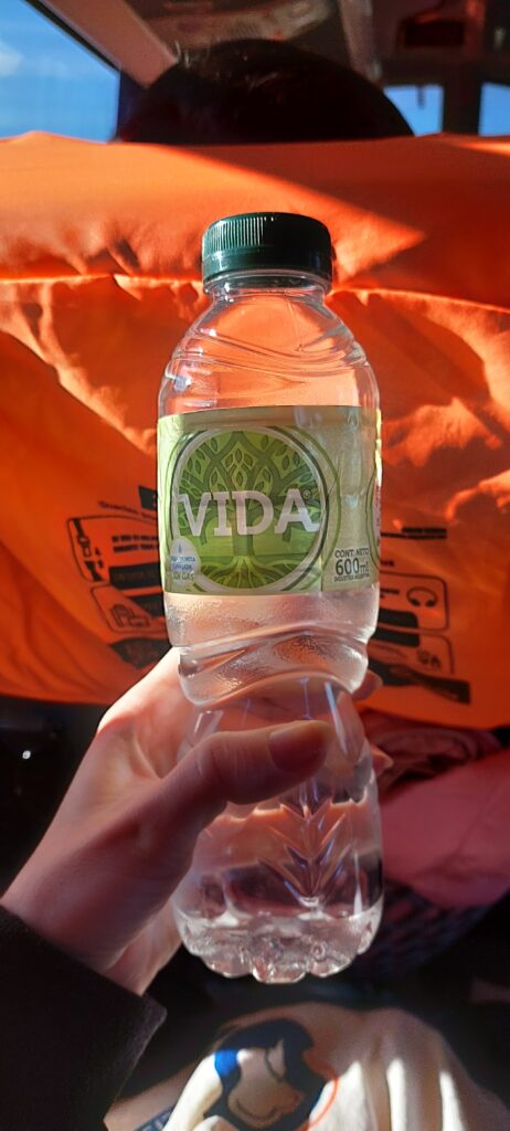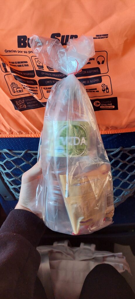 Ao embarcar em El Calafate, recebemos um saquinho com uma garrafa de 600ml de água; biscoito doce; e balas.