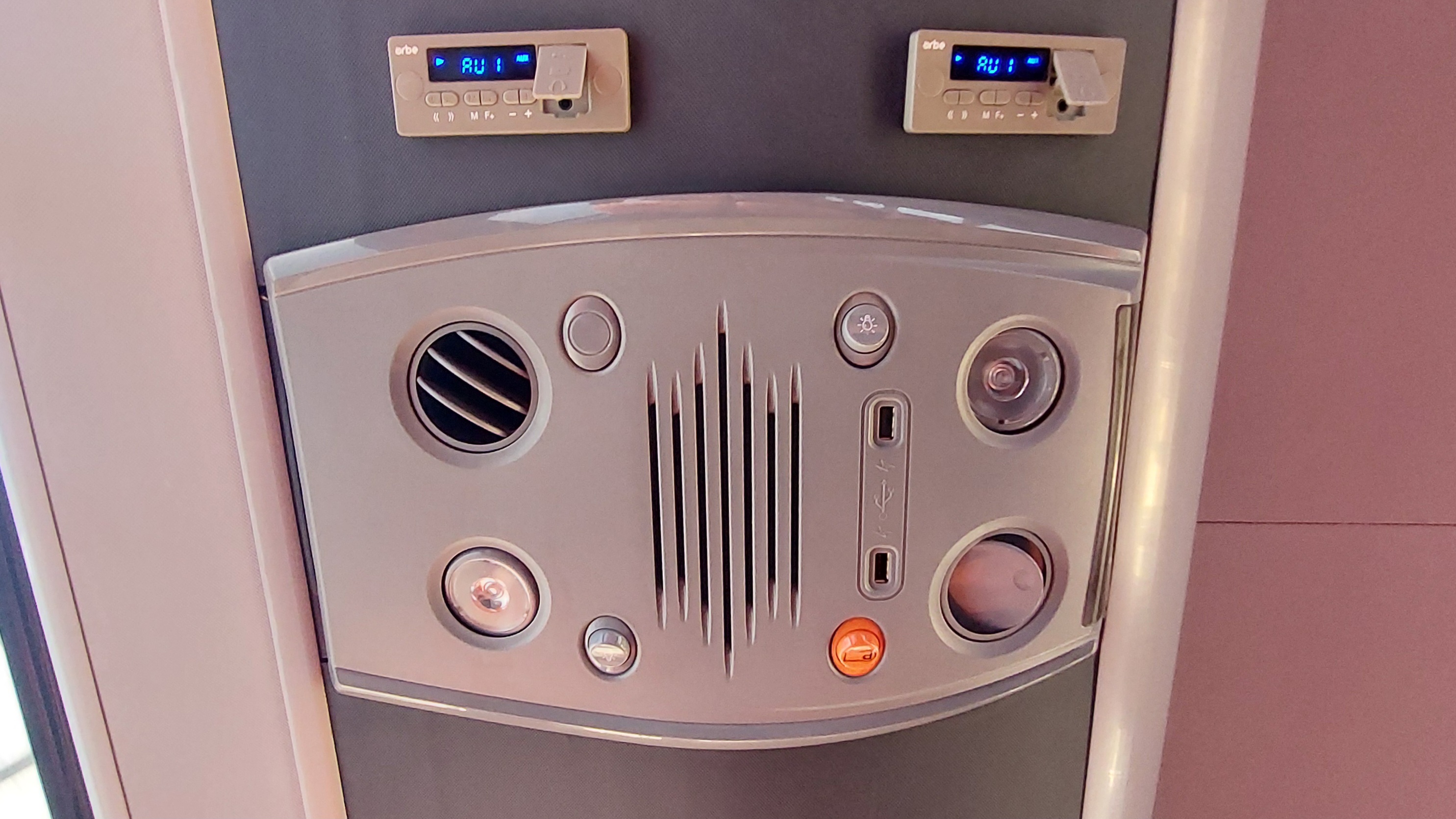 O ar-condicionado funcionava bem, cada assento tinha um luz de leitura e entrada USB para carregar eletrônicos.