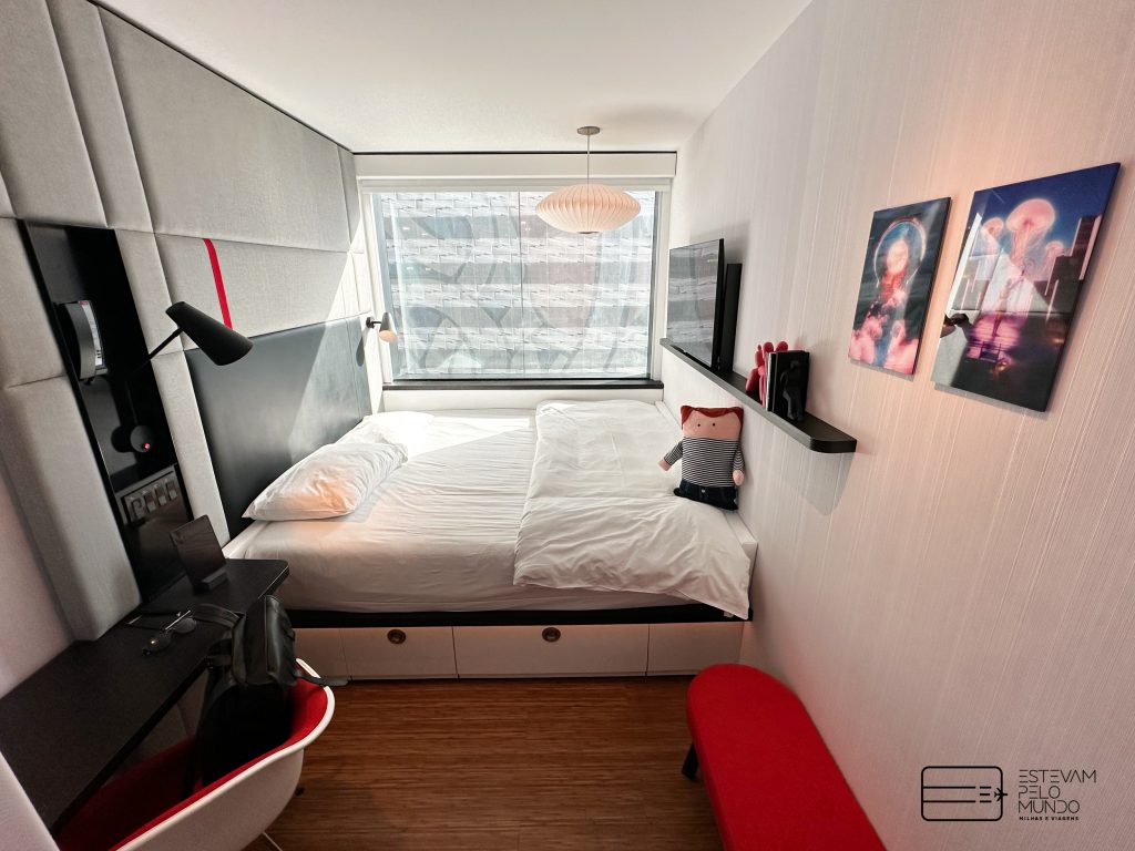 Escolhemos ficar no Citizenm Miami Brickell Hotel, que tem um conceito de luxo acessível. É um lugar que oferece design incrível, super bem localizado, com modernidades e facilidades, tudo automatizado, mas compacto.