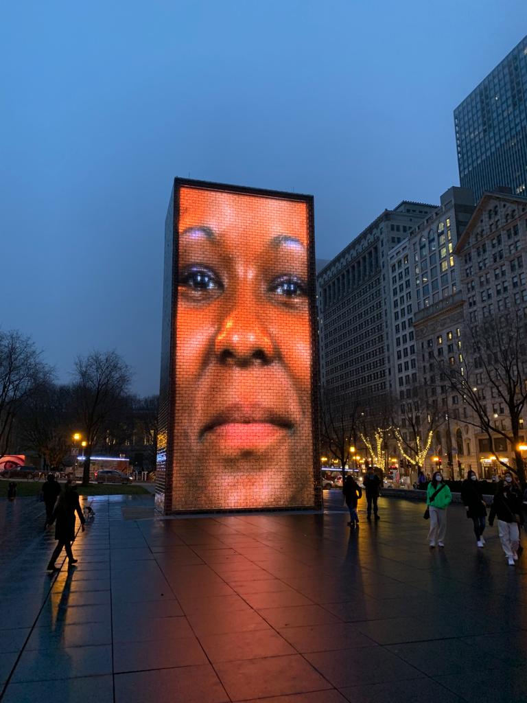 Crown Fountain – ao lado da Cloud Gate, há um espaço formado por duas torres com painéis de LED, uma de frente para outra, que recebem projeções de rostos de diferentes cidadãos da cidade.