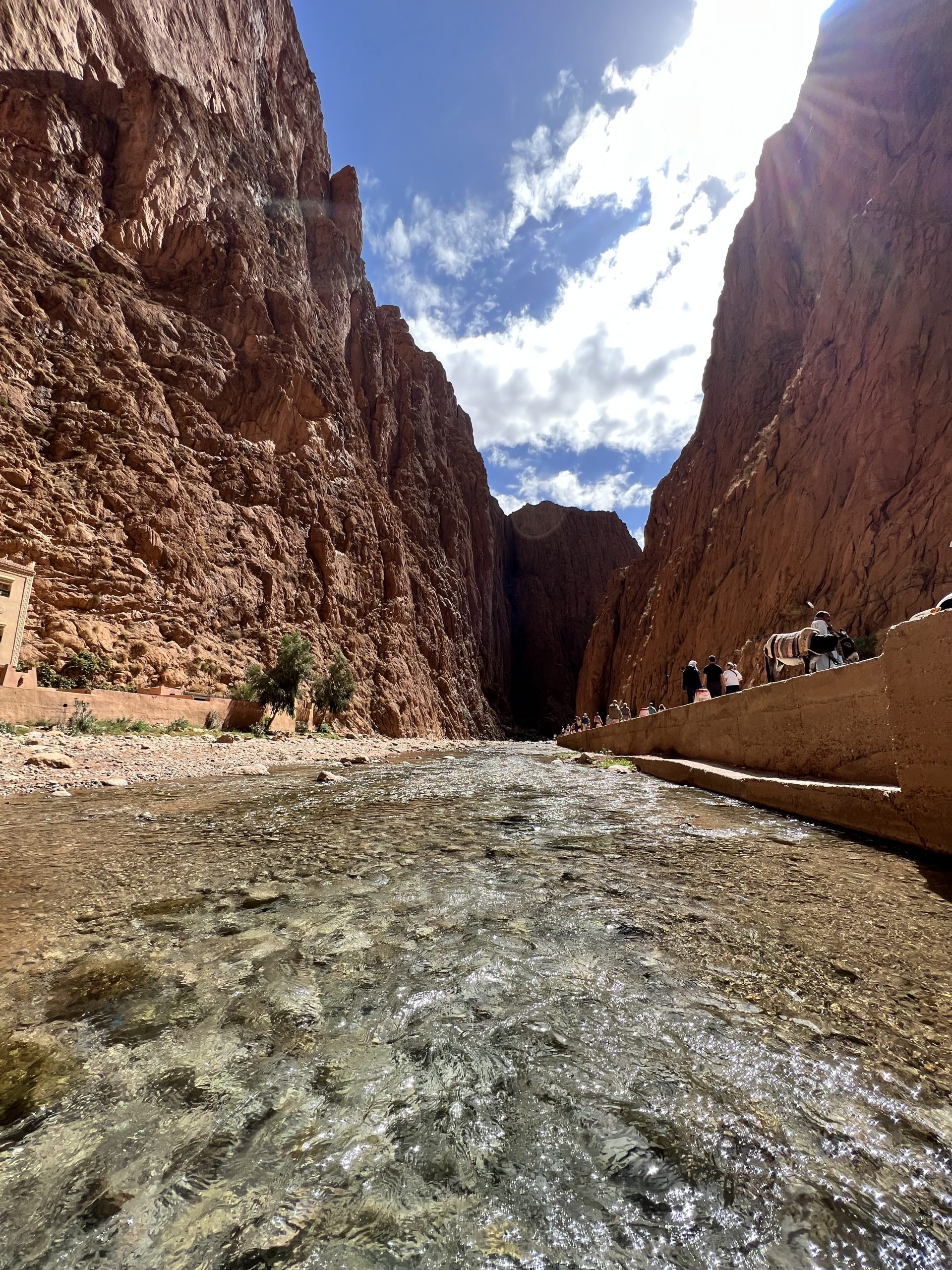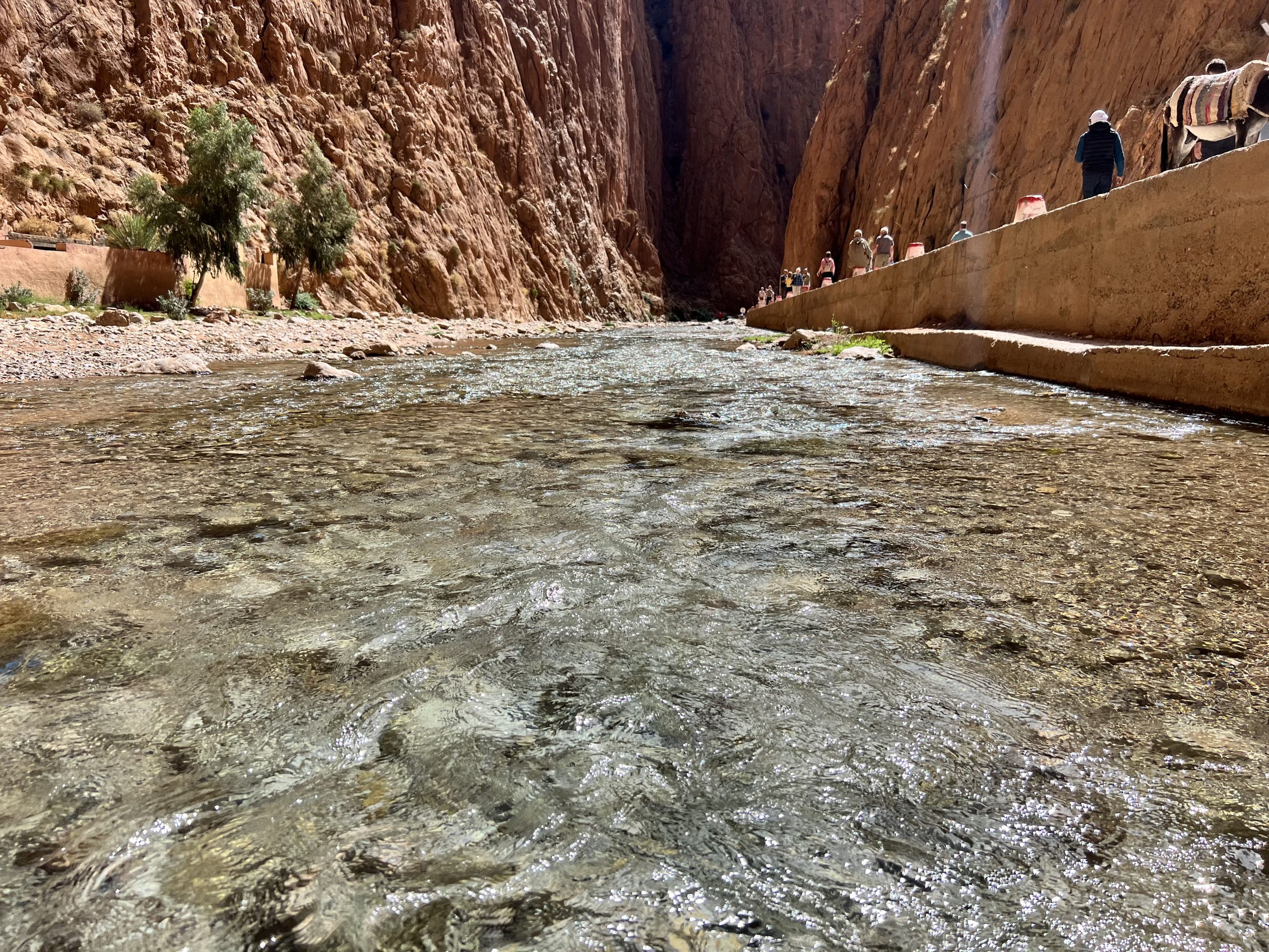 Nossa parada seguinte foi o Oásis de Todra que se destaca pela quantidade de verde em meio à paisagem marrom das montanhas. São 30 quilômetros de natureza que impressionam os viajantes. Ali também fica Todra Gorges, lugar onde estão as nascentes de águas que alimentam o oásis. Vale dizer eu essa água é limpa e potável e você pode se refrescar bebendo delas.