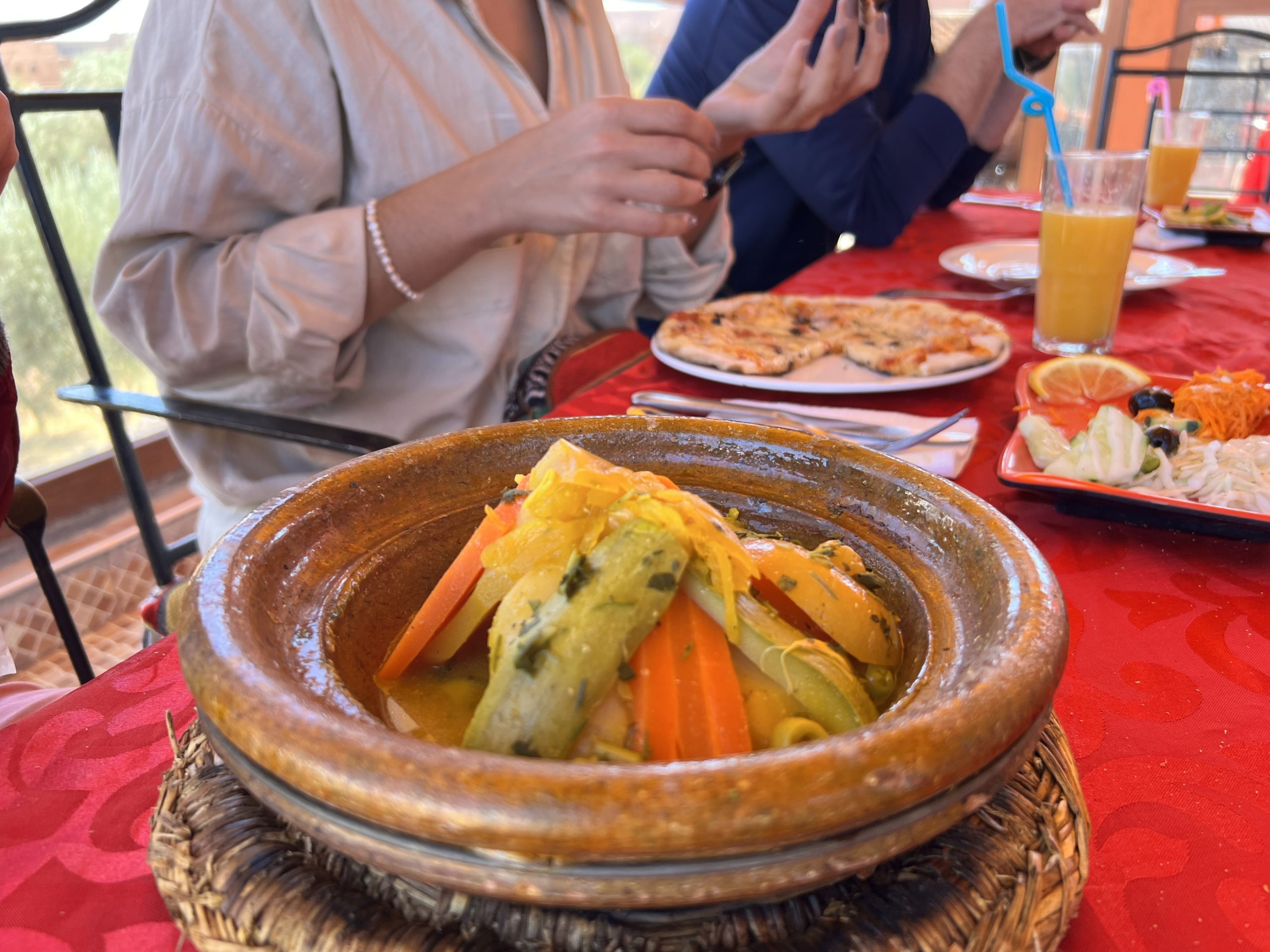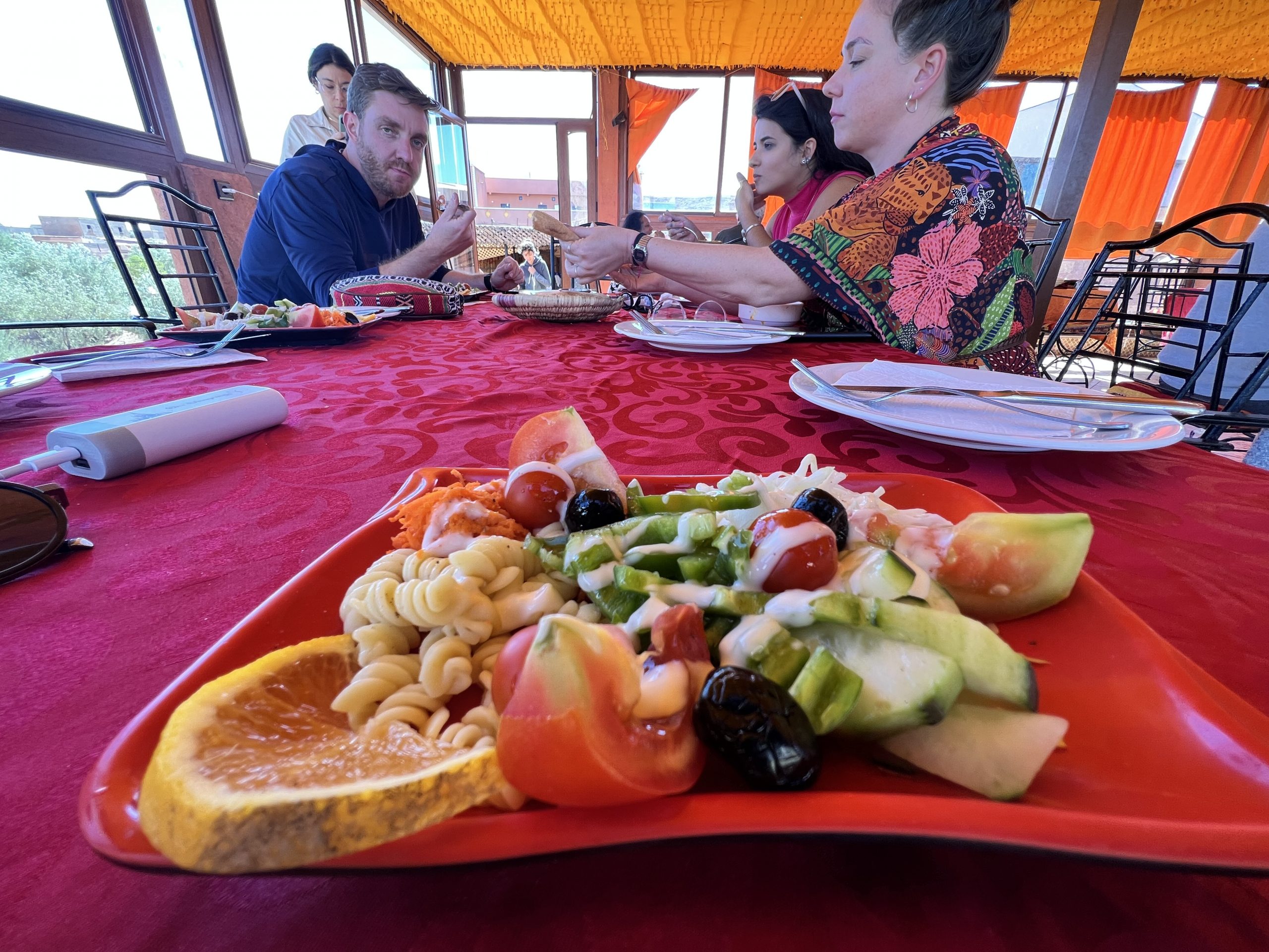 Antes de chegar ao Deserto do Saara, paramos em uma loja de roupas típicas e uma das nossas colegas decidiu também fazer uma tatuagem de hena. Aproveitamos a parada para almoçar no Touroug Cafe, bem ao lado da lojinha.