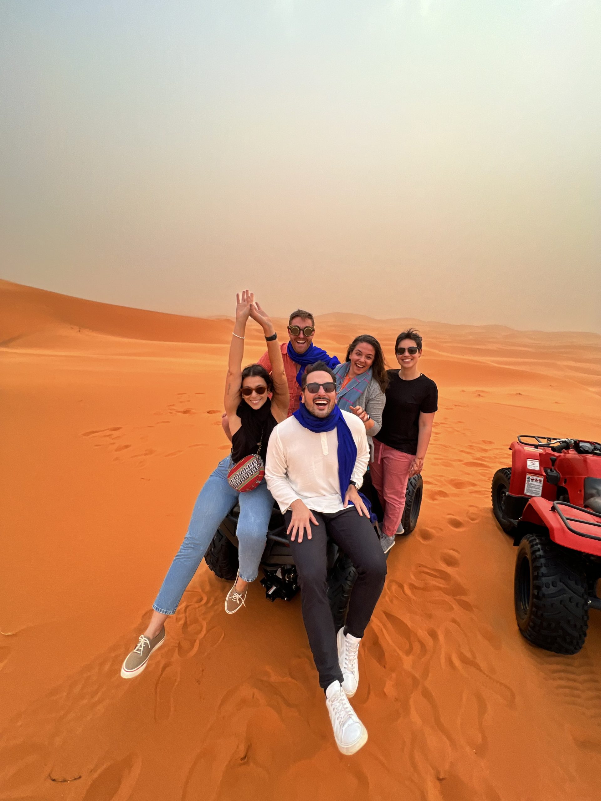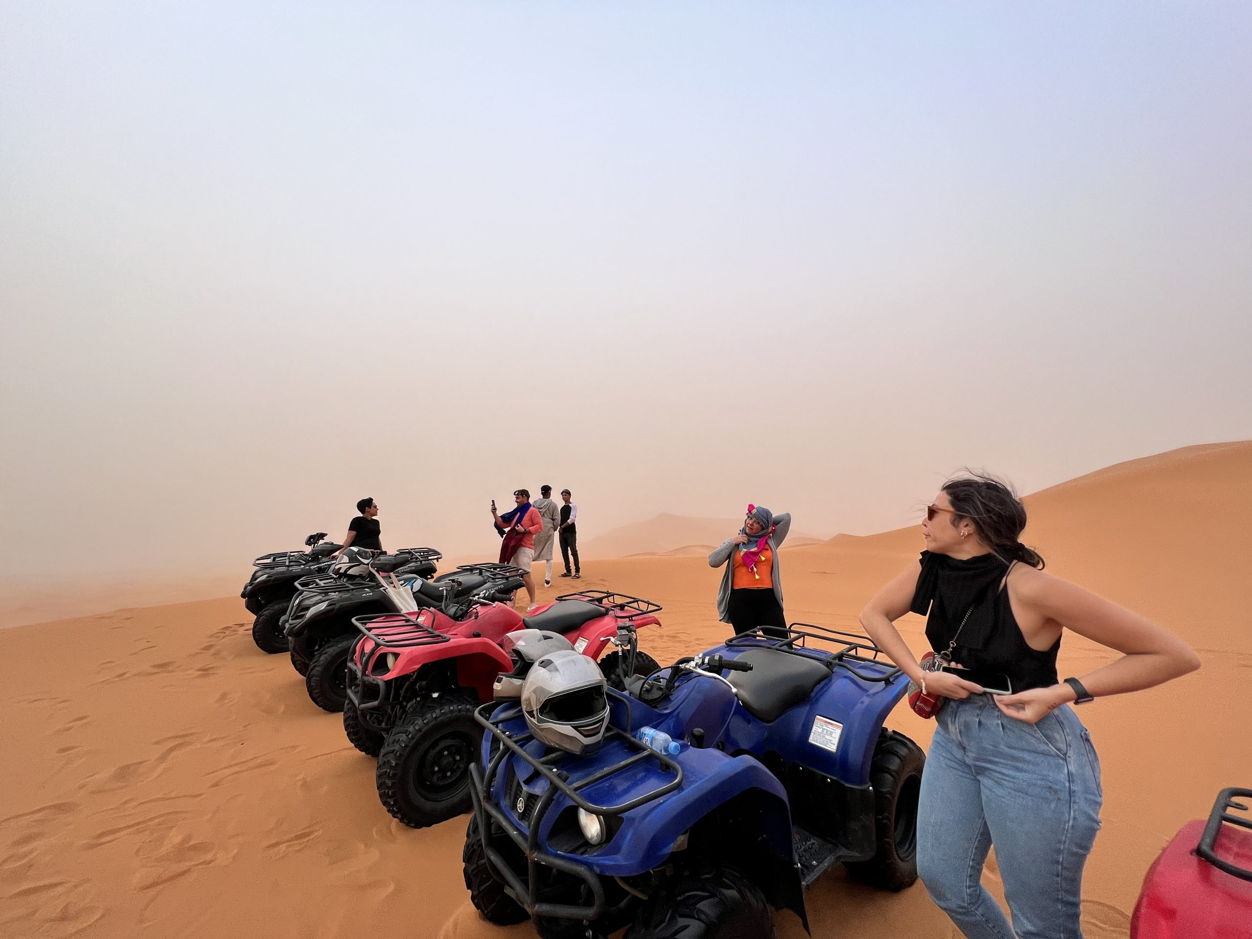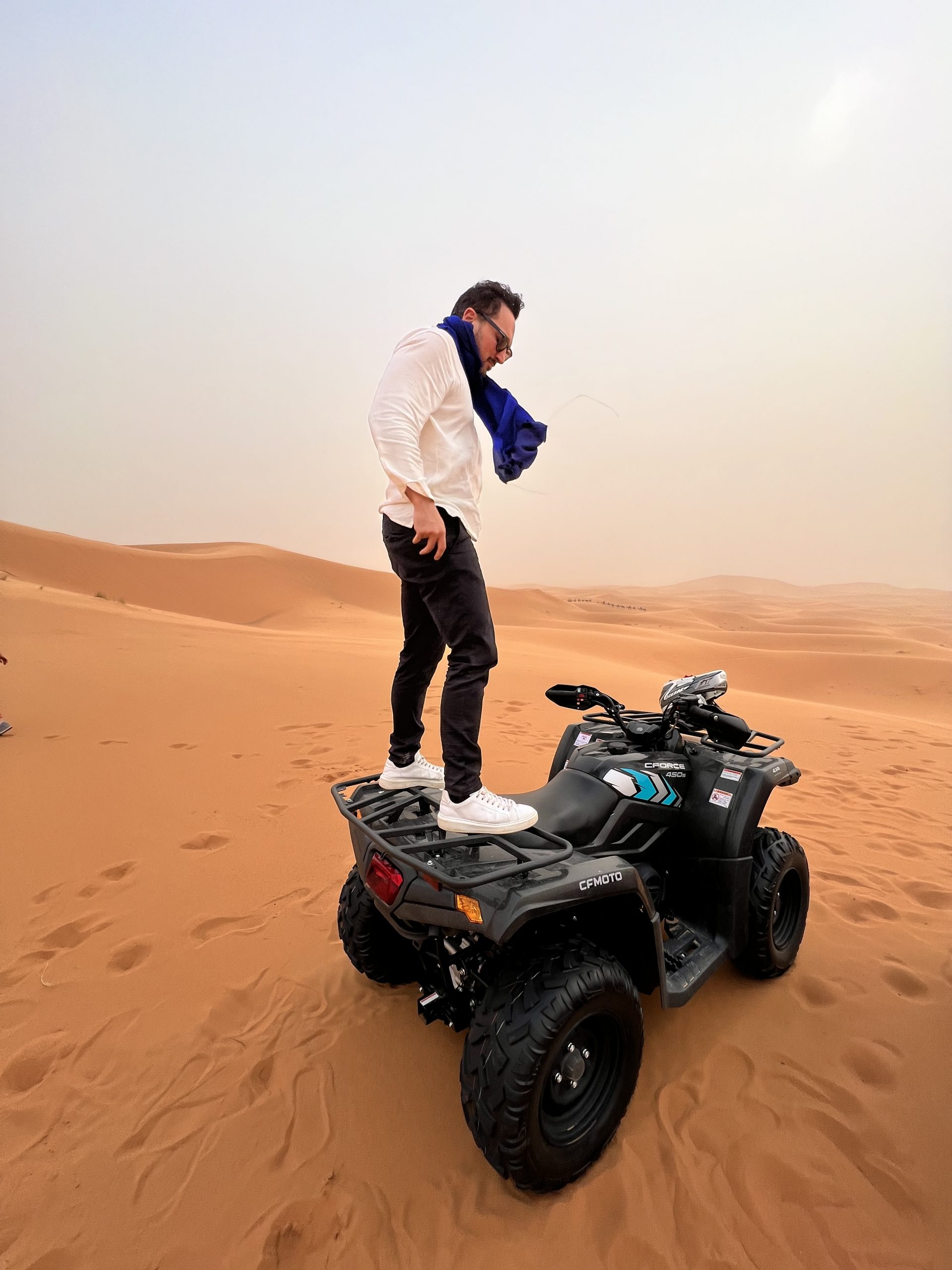 E a nossa última parte da viagem (cerca de 1 hora) foi feita em um quadriciclo já no deserto e até as barracas onde vamos passar a noite. Eu sempre sonhei em conhecer o Deserto do Saara! É impossível descrever essa sensação de estar cercado de areia por todos os lados. É uma paisagem sem fim e que muda o tempo por conta dos ventos que levam as areias de um lugar para o outro.