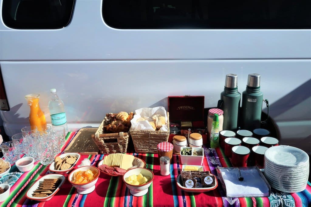 Com o pacote para Uyuni já reservado, um transfer nos busca em San Pedro do Atacama de manhã bem cedo rumo à fronteira com a Bolívia. Os postos de imigração já ficam no meio do deserto e temos a experiência deliciosa de tomar um café da manhã incrível com uma vista para as montanhas antes de começar a travessia.