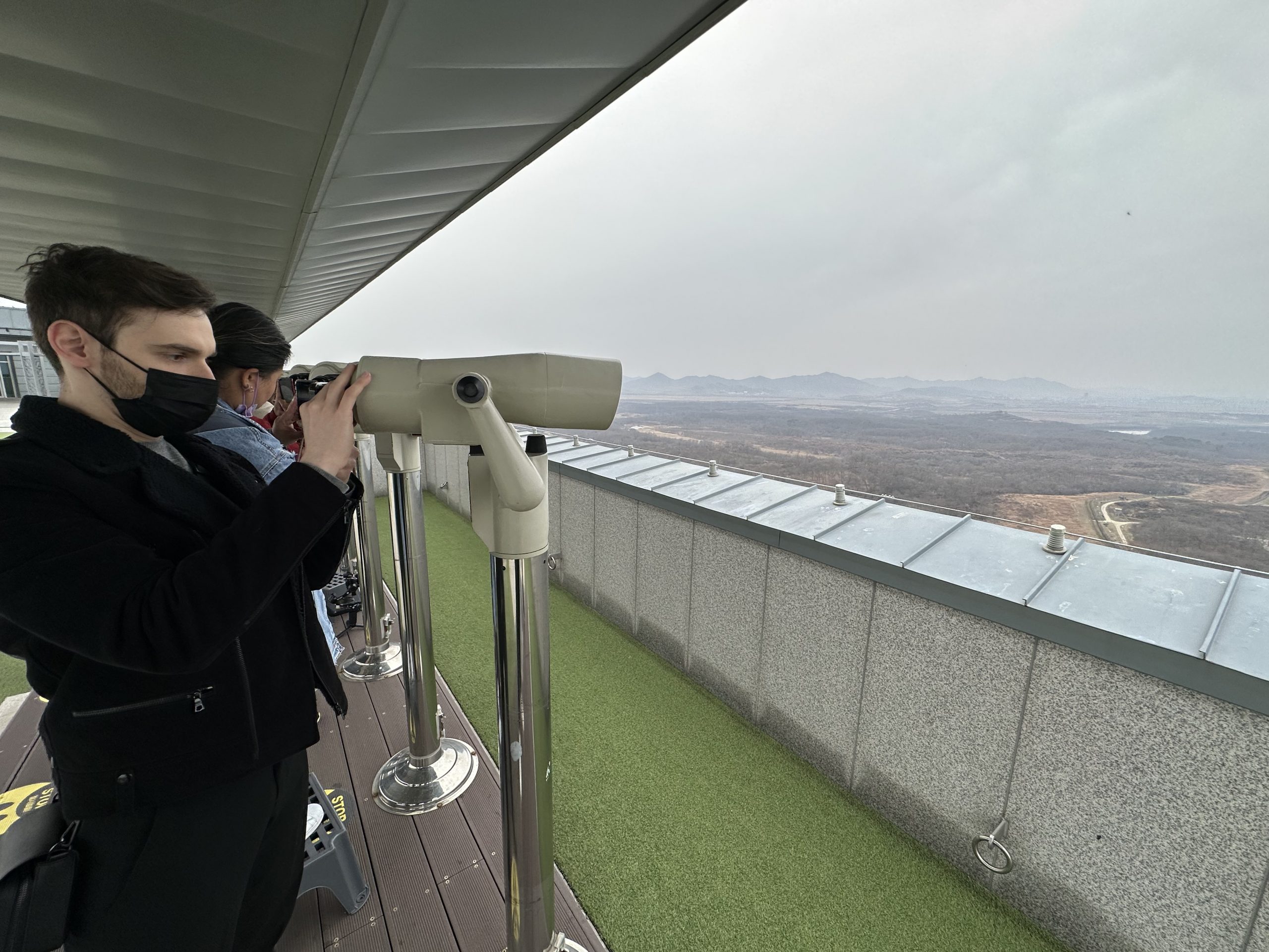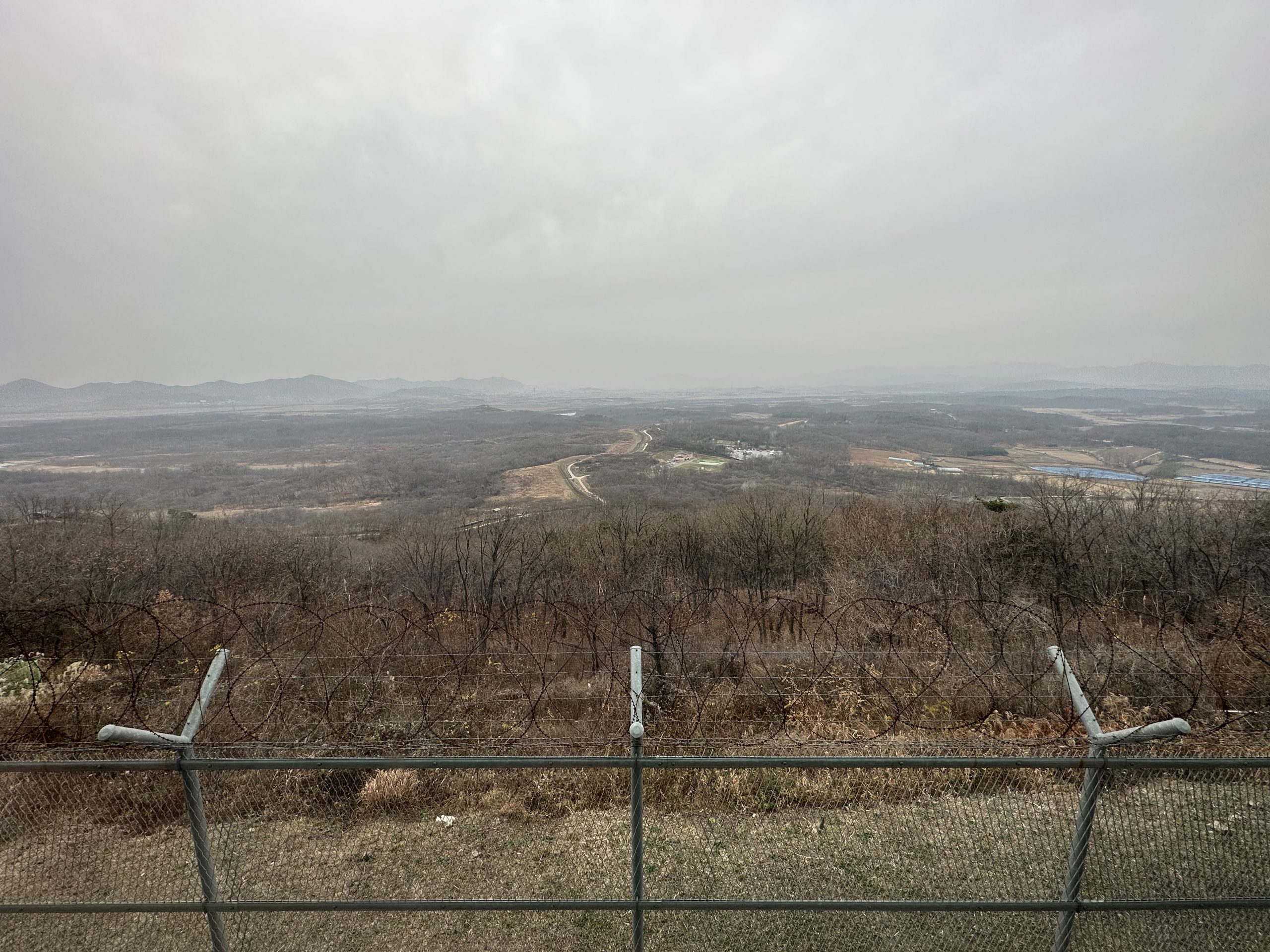 Depois do passeio pelo túnel, vamos até o observatório de onde se pode ver toda área de fronteira (DMZ) onde tem uma vila na parte sul que vivem cerca de 200 sul coreanos, e até algumas cidades da Coreia do Norte.