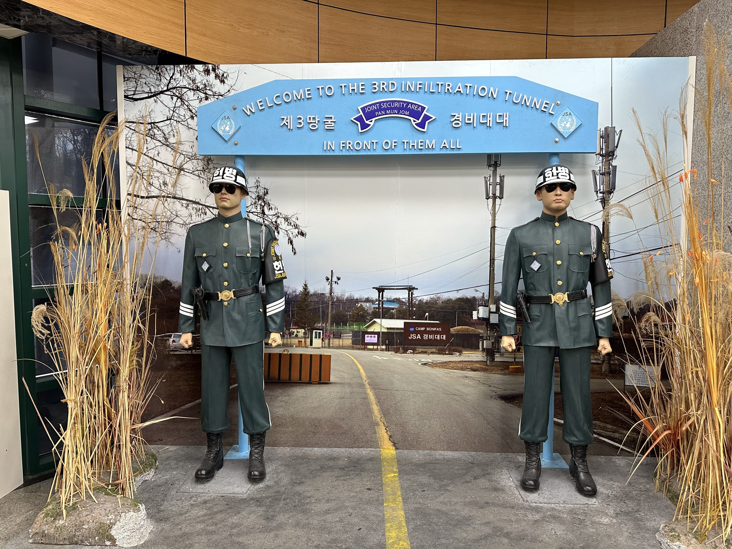 Como comentei, para entrar na Zona Desmilitarizada (em inglês, DMZ) é preciso utilizar um transporte militar que te leva até o local. A DMZ é uma região de 5km de largura localizada na fronteira entre as duas Coreias. Como comentei acima, as Coreias estiveram sempre em conflito e esta área foi criada devido ao armistício de 1953.