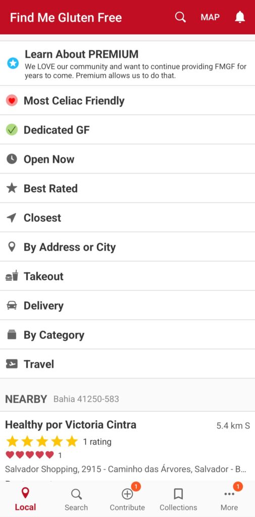 - Find Me Gluten Free – esse aplicativo reúne estabelecimentos que possuem opções de pratos sem glúten ou são especializados em alimentos quem atendem essa restrição. Além de mostrar uma lista de lugares próximos da sua localização via GPS, você pode fazer a busca para outra cidade, aeroportos, locais que tenham delivery, entre outros filtros. O Estevam, que atualmente vive com uma dieta gluten free, usa bastante esse aplicativo nas suas viagens.