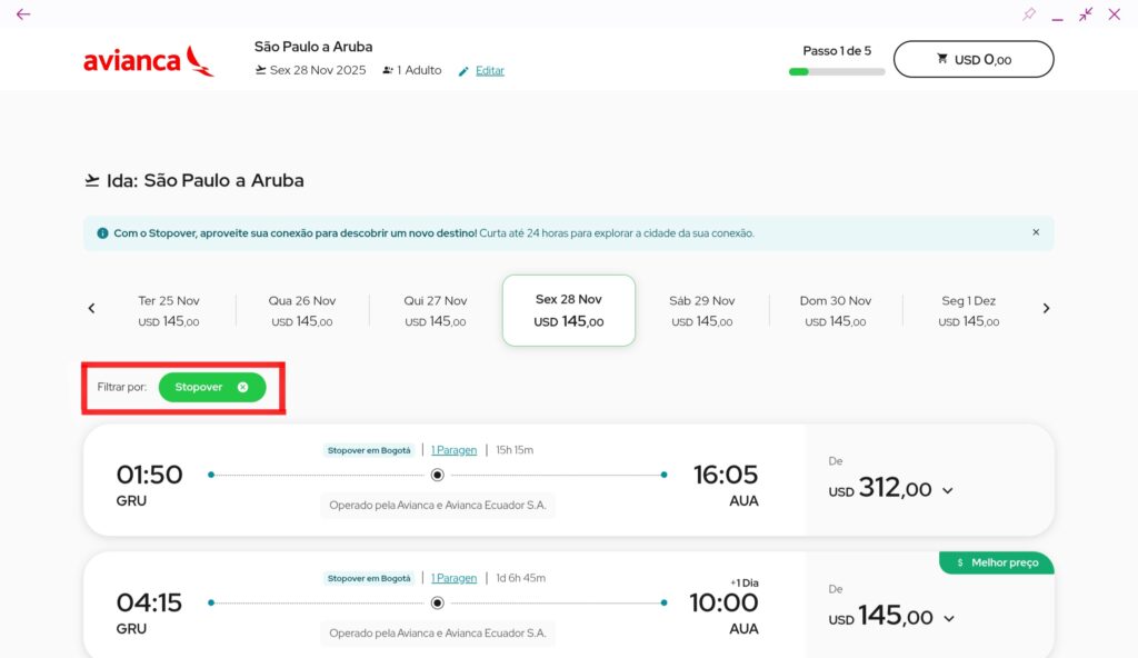 Fizemos uma simulação de busca de um voo de São Paulo a Aruba pela Avianca com conexão em Bogotá. Confira: