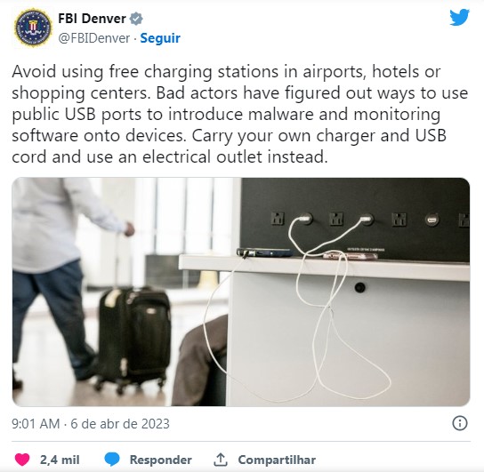 “Evitem usar estações de recarga gratuita em aeroportos, hotéis ou shoppings. Indivíduos mal-intencionados descobriram formas de usar portas USB públicas para introduzir malware e programas de monitoramento nos aparelhos”, informou o FBI.