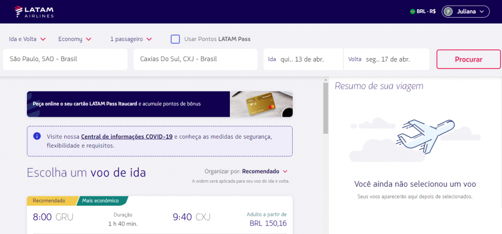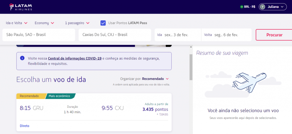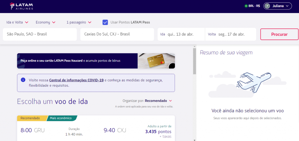 A Latam começou a operar, recentemente, a rota São Paulo (GRU) até Caxias do Sul, conforme compartilhamos AQUI, e está oferecendo passagens para esse novo destino da cia aérea numa condição muito especial, em pontos e em dinheiro.