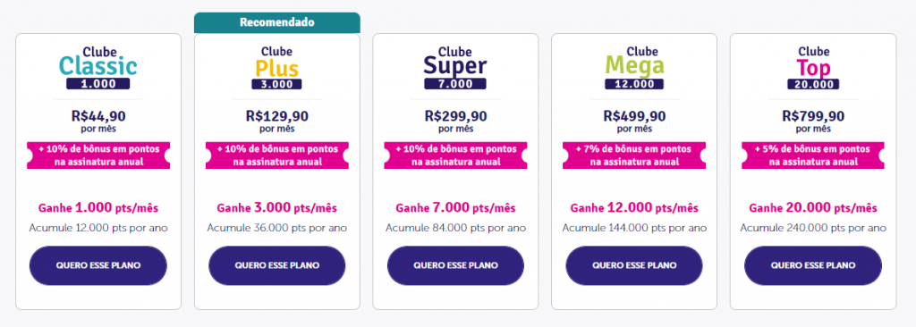 - o Clube Classic (1.000) resultará em 5.000 pontos extras gratuitos ao final de 20 meses;