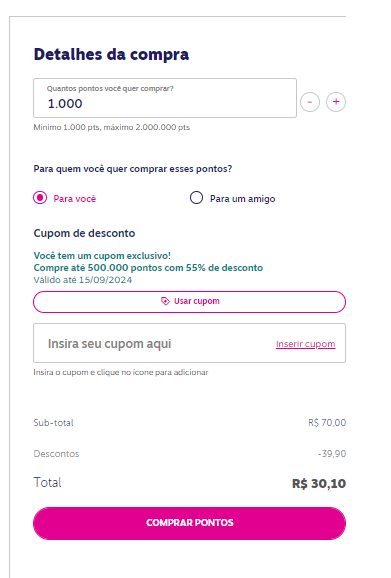 O desconto da promoção já estará aplicado na primeira página onde você orça quantos pontos quer comprar e o custo deles. Não é necessário adicionar nenhum cupom para garantir o desconto da promoção vigente.