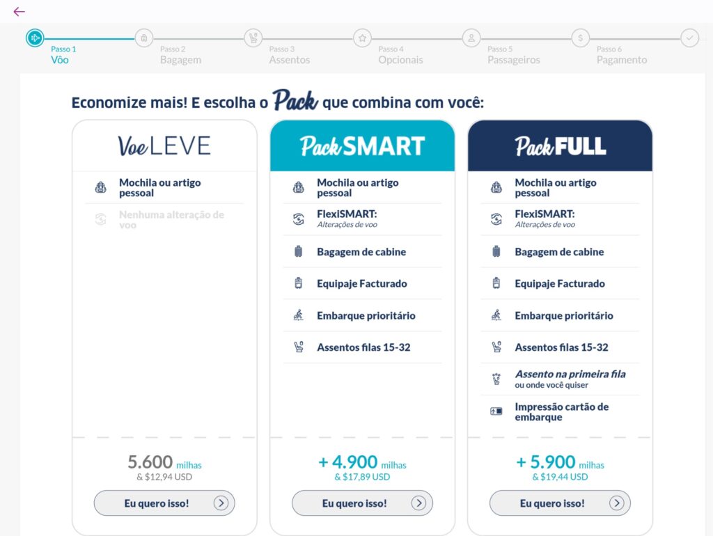 Vale lembrar que a JetSmart conta com 3 tipos de tarifas e, para cada uma delas, existe um determinado valor em pontos e taxas. Então, leia atentamente e faça as contas com atenção para garantir a melhor categoria de passagem.