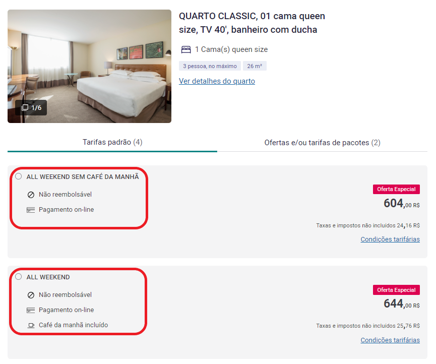 Conforme imagem acima, note que para o hotel selecionado há 2 ofertas da promoção ALL Weekend, uma com e outra sem café da manhã.