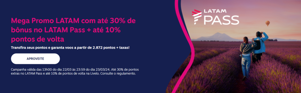 A Livelo está oferecendo até 30% de bônus na transferência de pontos para o LATAM Pass. E mais, até 10% de pointsback para assinantes do Clube Livelo. A promoção é válida até o dia 23 de março. Confira os detalhes abaixo!