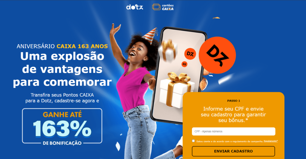 Para encerrar as promoções de transferências bonificadas a Caixa está proporcionando um bônus de até 163% na transferência de pontos para o Dotz, marcando este dia especial com uma oferta incrível. Lembre-se, esta promoção exclusiva é válida apenas hoje, em 12 de janeiro de 2024.