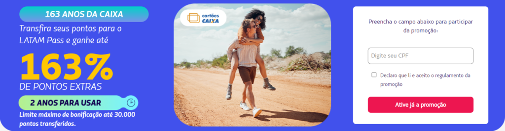 Continuando com as promoções do seu aniversário, a Caixa está proporcionando um bônus de até 163% na transferência de pontos para o LATAM Pass, marcando este dia especial com uma ótima oferta. Lembre-se, esta promoção exclusiva é válida apenas hoje, 12 de janeiro.