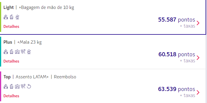 - Todas as passagens resgatadas terão as mesmas características de uma passagem em dinheiro, portanto você poderá escolher a opção que melhor se adapta às suas necessidades: Light, Plus e Top. Contudo, isso significará, considerando o cenário atual, um aumento significativo do preço em milhas da maioria das passagens;