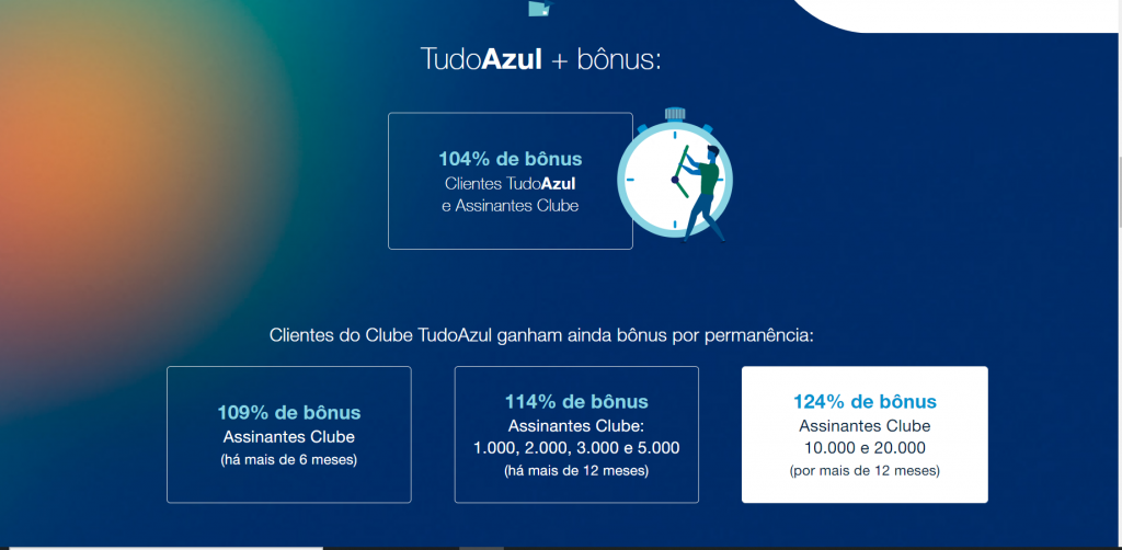Clientes Clube TudoAzul 10.000 ou 20.000 há mais de 12 meses recebem mais 20% de bônus sobre os pontos transferidos. O limite de bônus cumulativo também é de 20.000 pontos por ano.