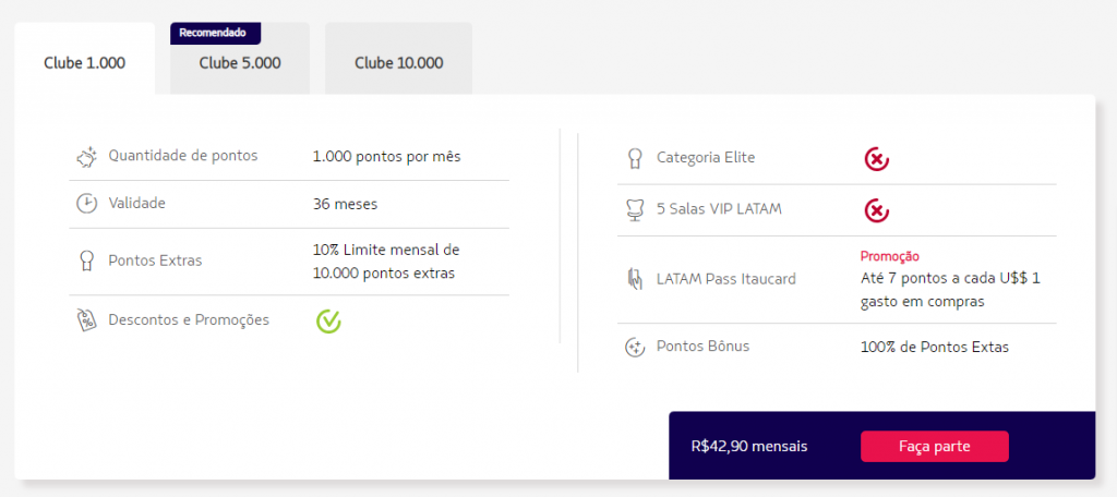 O Clube LATAM Pass é um clube de assinaturas mensal de pontos e benefícios exclusivos LATAM para você. Escolha um dos planos de acordo com o número de pontos que você quer receber por mês e aproveite todos os benefícios!