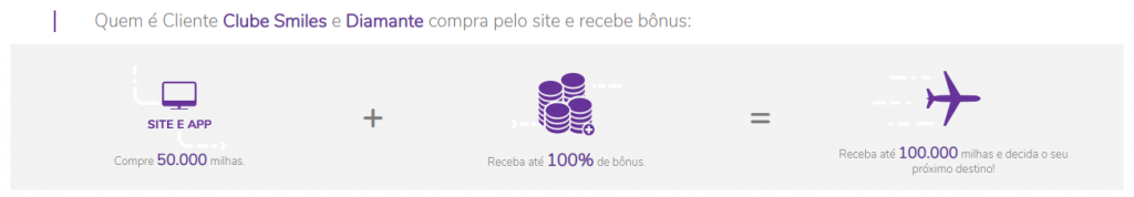 Além disso, quem é Cliente Smiles recebe 40% de bônus, enquanto quem é Clube Smiles ou categoria Diamante recebe 100% de bônus ao comprar milhas.