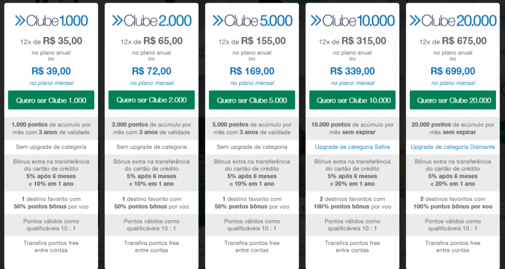 O valor dos Clubes varia entre R$ 35,00/mês e R$ 699,00/mês, e a pontuação a ser acumulada, mensalmente, varia de 1.000 a 20.000 pontos.