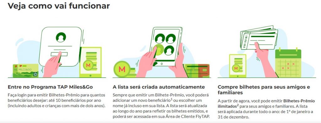 De acordo com a informação já constante no site da TAP, os participantes do seu programa de fidelidade Miles&Go passarão a ter uma lista anual (de 1º de janeiro a 31 de dezembro) de dez beneficiários para emissão de passagens prêmio.