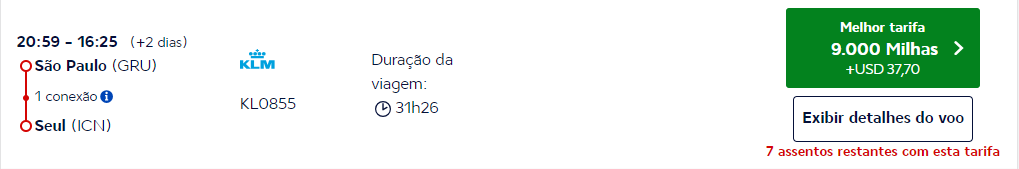 É possível encontrar passagens com a cia aérea KLM para Seoul (ICN), partindo de São Paulo (GRU), a partir de 9.000 milhas Flying Blue (o trecho), além das taxas, com opções nos mês de novembro de 2023. Confira um exemplo:
