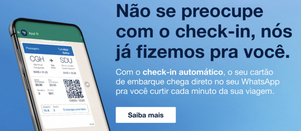 A própria Azul identifica os Clientes que ainda não fizeram check-in e estão com os dados completos e, em seguida, faz a marcação do assento, enviando, por fim, o cartão de embarque pronto por WhatsApp, oferecendo praticidade e agilidade.
