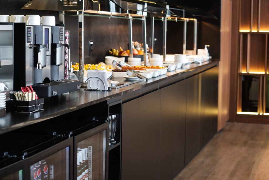Bem como opções de bebidas e alimentos em um elegante formato de buffet: