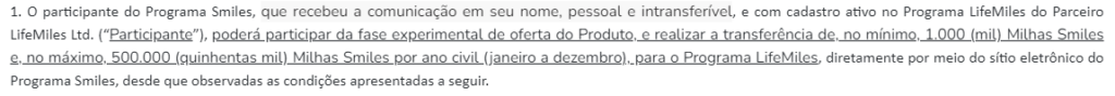 Ainda de acordo com o regulamento que estava vigente, não havia uma limitação total de milhas que poderiam ser transferidas por ano., conforme fica evidente nessa parte do regulamento: