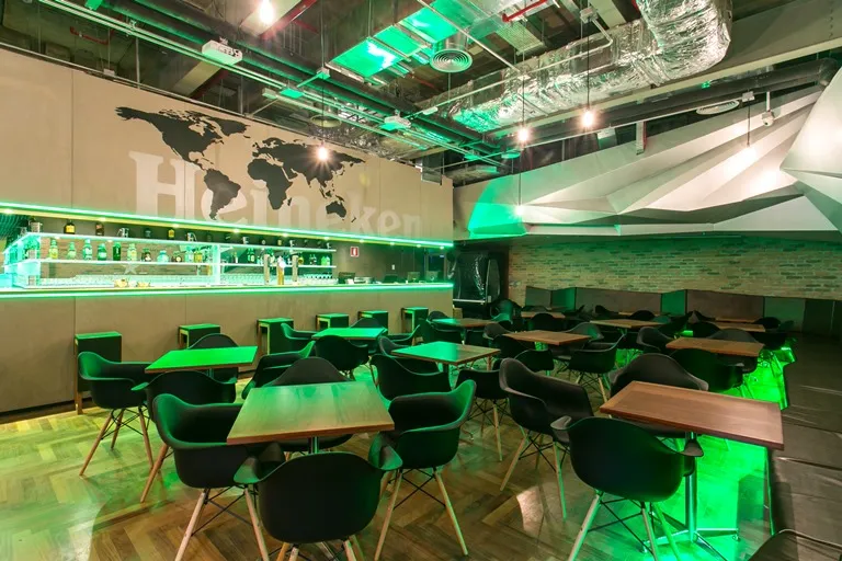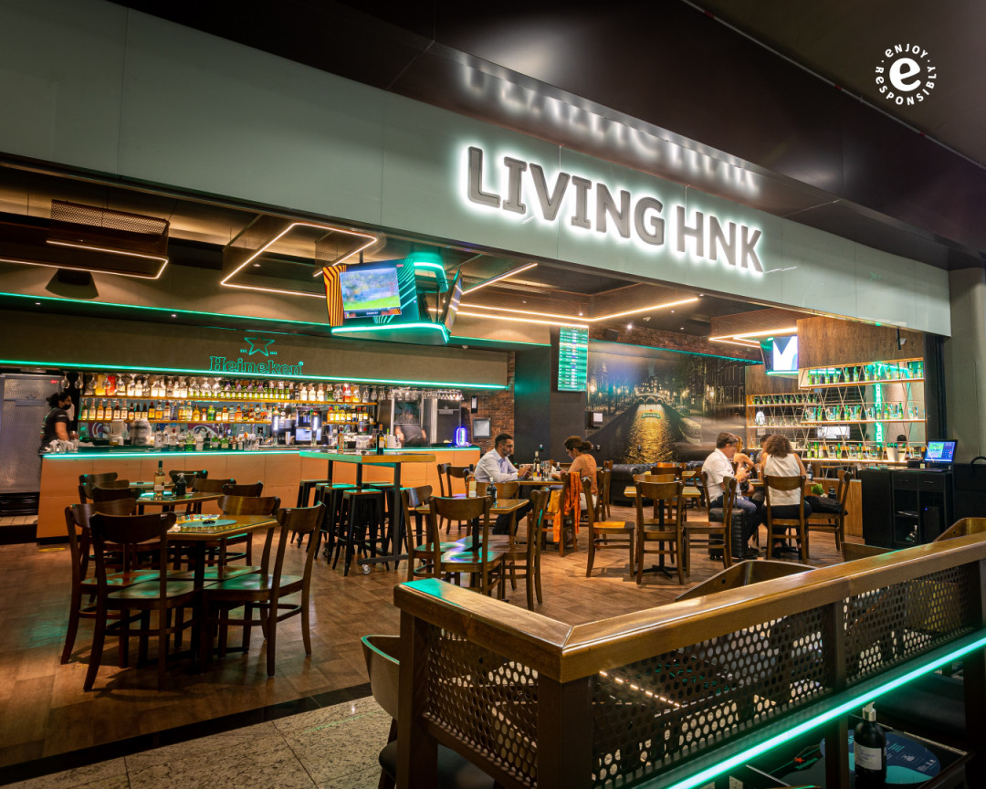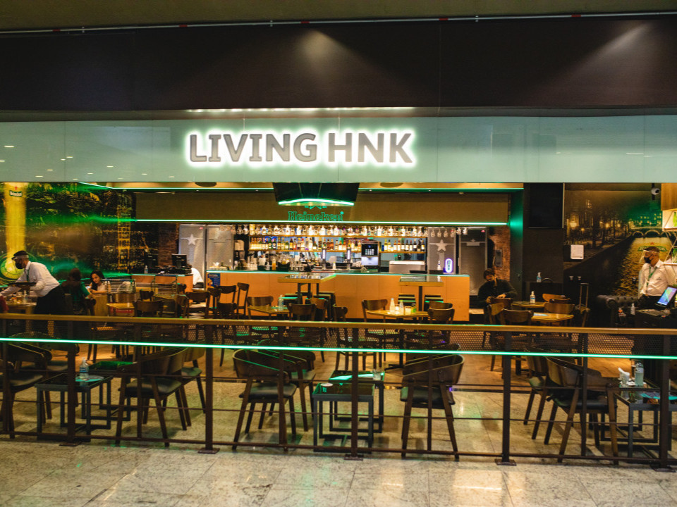 O Living Heineken oferece um ambiente moderno, alinhado com a identidade visual da marca, incluindo iluminação em tons de verde e telões que exibem os principais eventos esportivos. O local é perfeito tanto para quem busca uma experiência descontraída quanto para quem deseja relaxar antes do voo.
