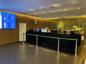Igualmente, em tempos normais, basta solicitar na recepção e é por ordem de chegada. Cada passageiro (ou grupo de passageiros) pode ficar até duas horas. Caso não haja mais ninguém na fila, a estádia pode ser estendida até que chegue outro passageiro e solicite o espaço.