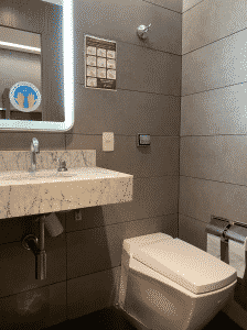 Pois bem, nos fundos do banheiro há uma ducha, naturalmente isolada por uma porta. Junto há também um outro sanitário. O lounge providência tudo: toalhas, sabonetes e etc. Basta solicitar na recepção. Mesmo durante a pandemia está funcionando. O serviço é gratuito e por ordem de chegada.